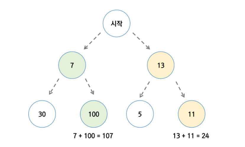 각 단계에서의 값을 더해 최대값을 구하는 문제에서, 최적해는 초록 라인을 따라가서 얻는 107이지만, 그리디 알고리즘을 이용할 경우 7보다 큰 13을 선택하고, 5와 11 중 11을 선택하여 최종적으로 24라는 값을 얻게 된다. 즉, 그리디 알고리즘이 최적해를 보장해주지는 않는다.