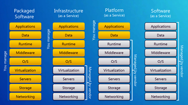클라우드 컴퓨팅이 도입되면서, 이전에는 사용자가 모두 IT 인프라의 구성 요소를 관리해야 했었던 반면, 이제는 일정 부분을 클라우드에서 내려받는 형태가 도입되었다. 그 비중(사용자 관리 : 클라우드 제공) 에 따라 Packaged Software, IaaS, PaaS, SaaS 로 나뉜다.