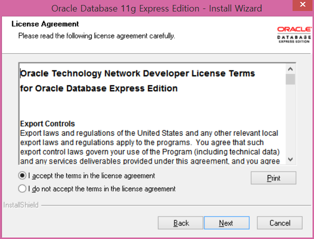 1. 라이선스 동의하고 next, 설치 경로 설정(default: C:\oraclexe)