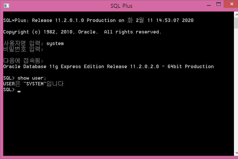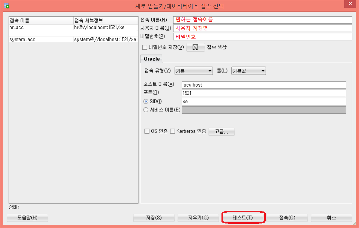 1. 사용자명: system, 비밀번호: oracle (오라클 설치 시 설정했던 비밀번호)