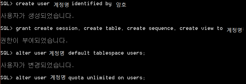 ② SQL> grant create session, create table, create sequence, create view to 계정;