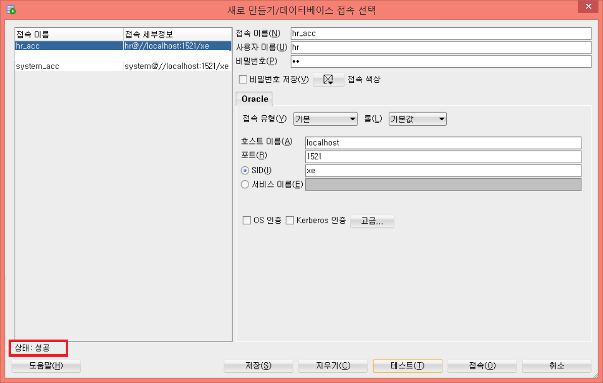 내용을 입력하고 테스트 버튼을 누른다. 문제가 없다면 상태: 성공이라고 업데이트된다. 접속 버튼을 누르면 완료!!