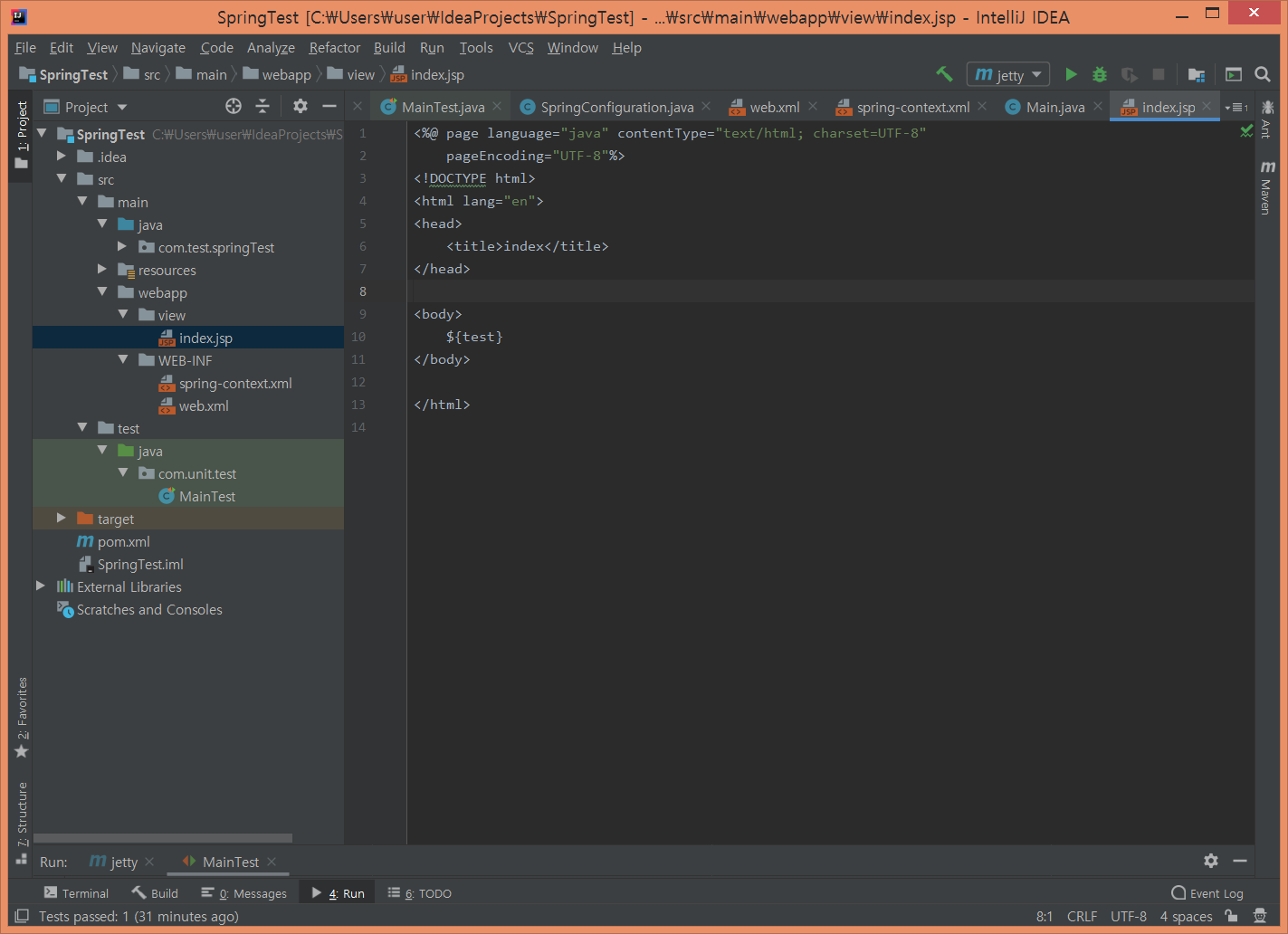 model.addAttribute("test", "Hello world! This is Spring MVC project by using IntelliJ");