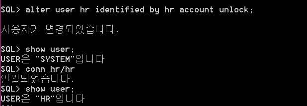 SQL> alter user hr(계정) identified by hr(암호) account unlock;
